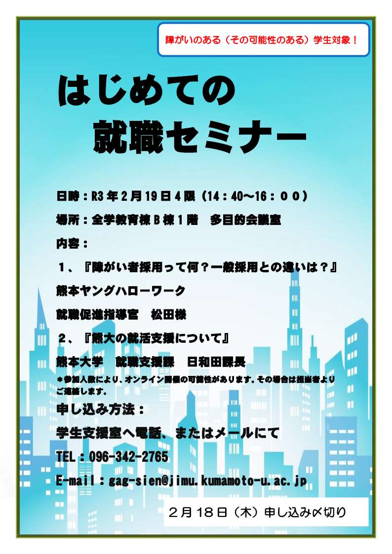 2020年度 【就活】伟德体育_伟德国际app【娱乐官网】感染症拡大地域への移動自粛について 【企業様向け】就職活動における伟德体育_伟德国际app【娱乐官网】感染症拡大地域への移動自粛に関して協力のお願い 【就活】伟德体育_伟德国际app【娱乐官网】感染症拡大地域への移動自粛の解除について 夏期インターンシップ参加に係る伟德体育_伟德国际app【娱乐官网】への対応について 【就活】2022年卒向け就職ガイダンス(企業就職向け)の公開について 【就活】就職活動やインターンシップ等への参加に伴う移動について 【就活】2021年卒向け就活RE☆STARTガイダンスの公開について 【就活】2022年卒向け 就職準備講座(企業就職向け)の公開について 【就活】ZoomによるOWN就活アドバイス会を実施しました 【就活】(全学年対象)11/25 キャリア啓発セミナーJob Studyの開催 【就活】2022年卒向け業界研究講座の開催 12/1~ 【就活】(障がいのある(その可能性のある)学生対象)はじめての就職セミナーの開催について 就活セミナーポスター.jpg
